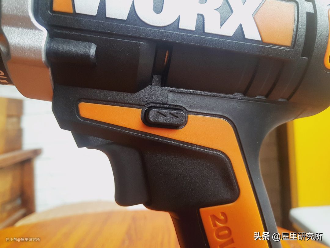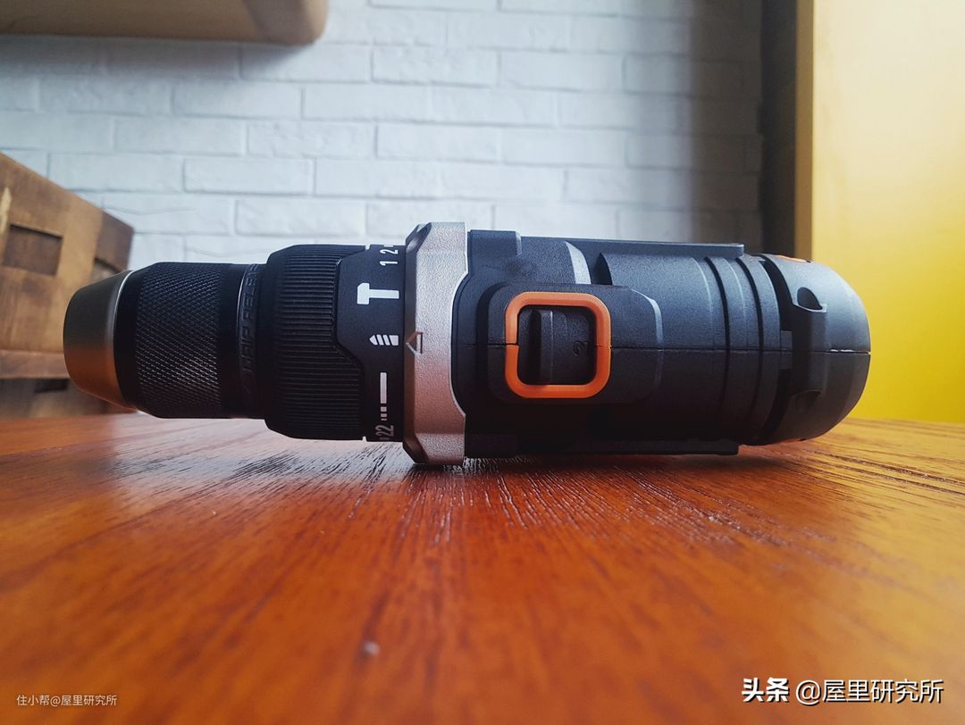 顶部橙色框框里面这个按钮是机械调速扭,分别两个模式,1档转速高扭矩,低转速,适合钻入较粗的钻头或者拧螺丝,2档转速适用钻入较细的钻头。