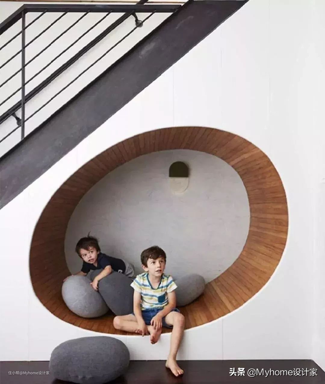 谁说楼梯下方一定要用尽,不妨像这样随意在楼梯下方划出圆形空间,搭配壁灯、坐垫,就成为小孩的秘密基地。
