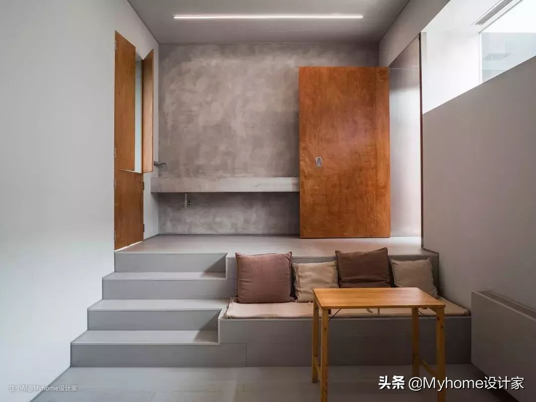 混凝土楼梯分成两半,一侧维持行走机能,另一侧则布置抱枕、坐垫,搭配茶几,就成了泡茶品茗的休憩场所。