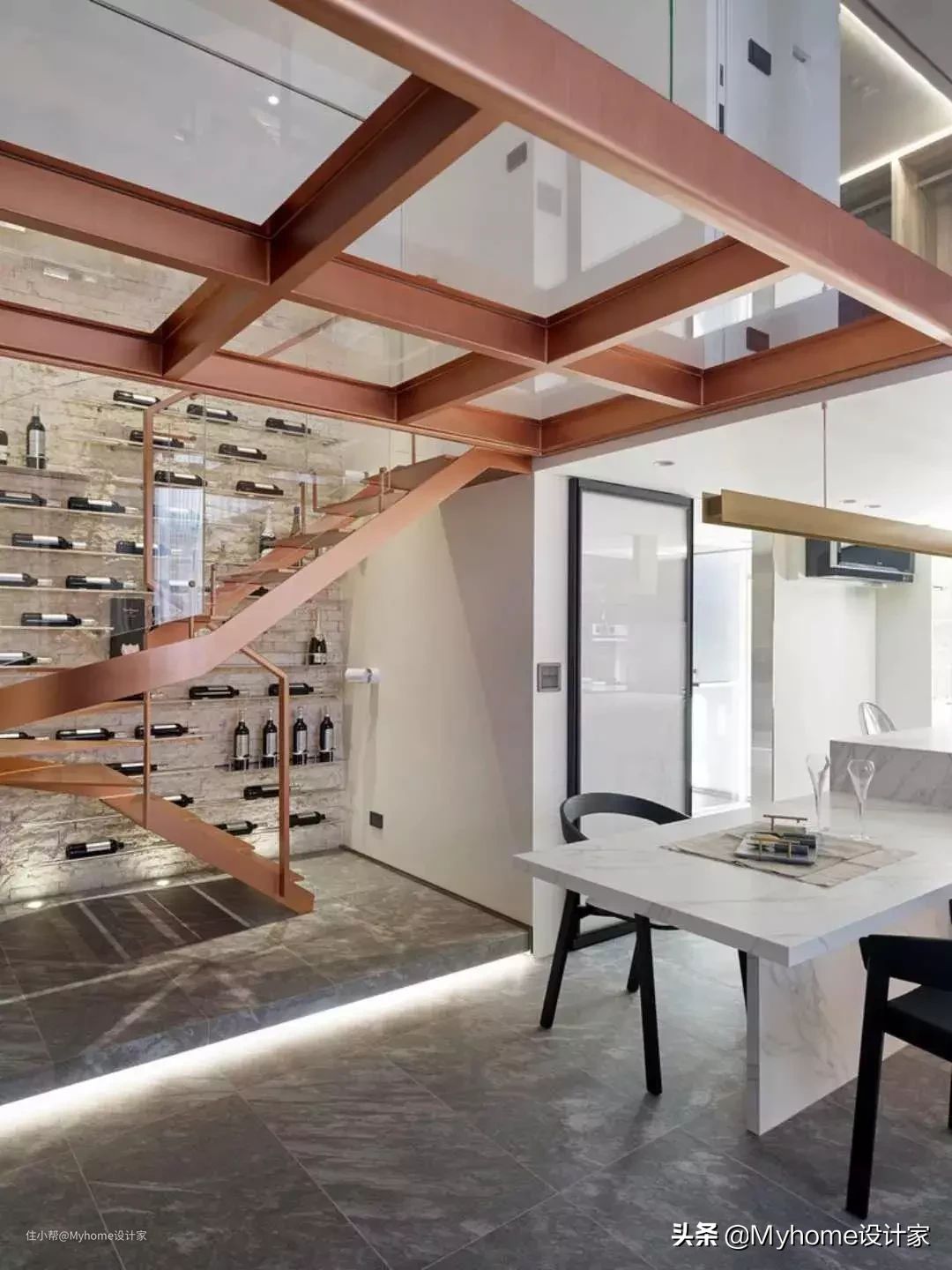楼梯运用钢骨架构,自带贵气的红铜色系流露轻奢质感,墙面搭配纤薄的铁艺搁板,收纳大量藏酒,就成了空间中一道美丽风景。