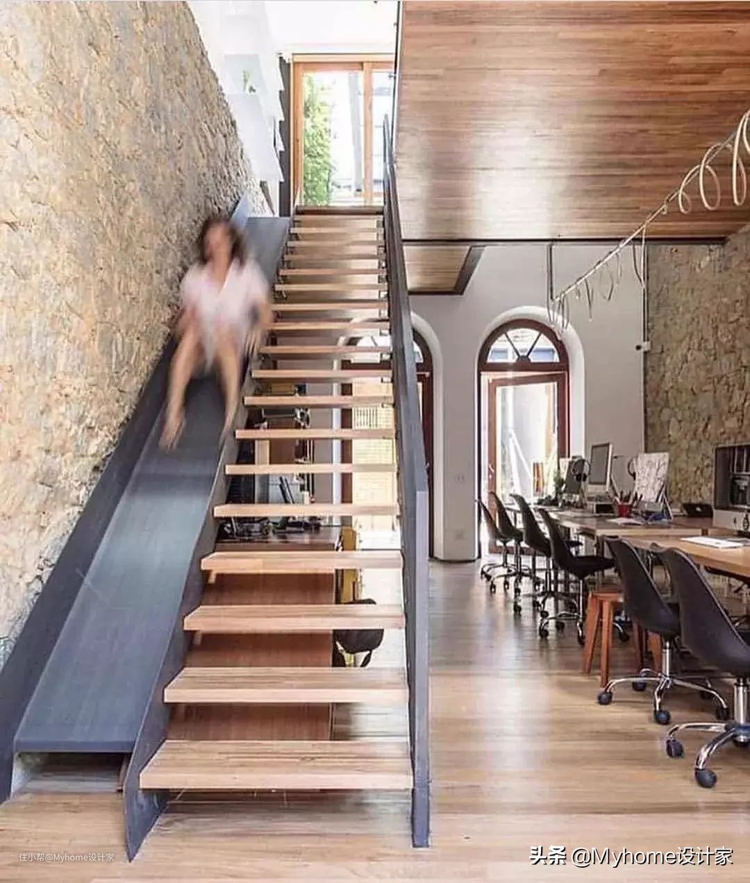 想让生活有更多乐趣,就在家里打造滑梯吧!沿着楼梯架设滑梯,小孩就能尽情玩乐,打造绝妙的游乐场所,就想赖在家里不出门。