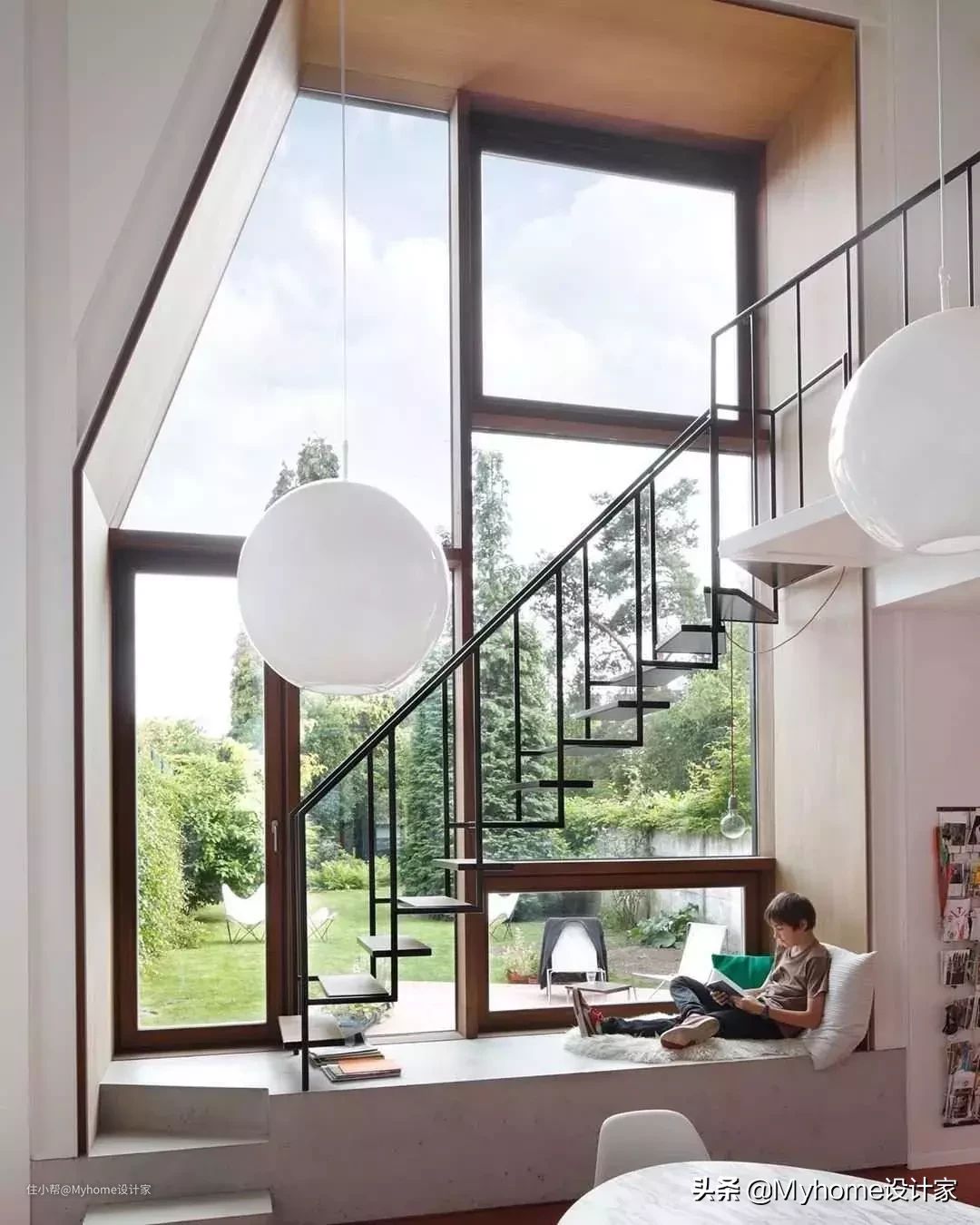 为了不浪费大面窗景,楼梯下方设置飘窗,能当作阅读、发懒的好去处,特地选用纤细的铁艺楼梯,即便坐在楼梯下也不显压迫。