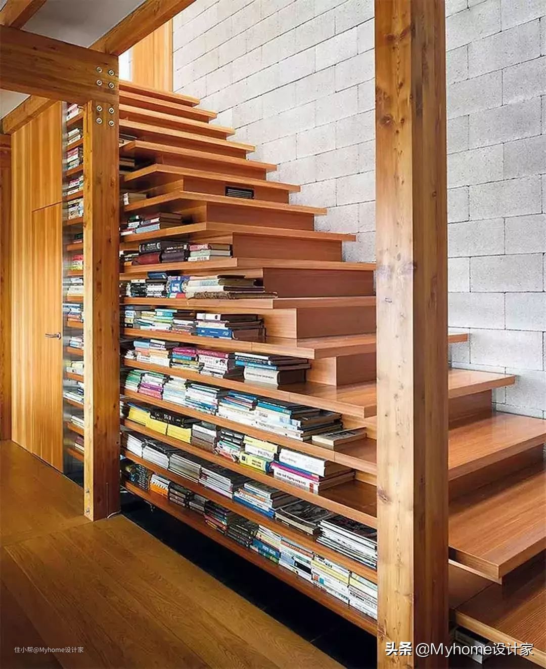 每层木质踏步刻意打造内缩空间,就能收进大量书本,不放过任何一平米,连楼梯都榨干!
