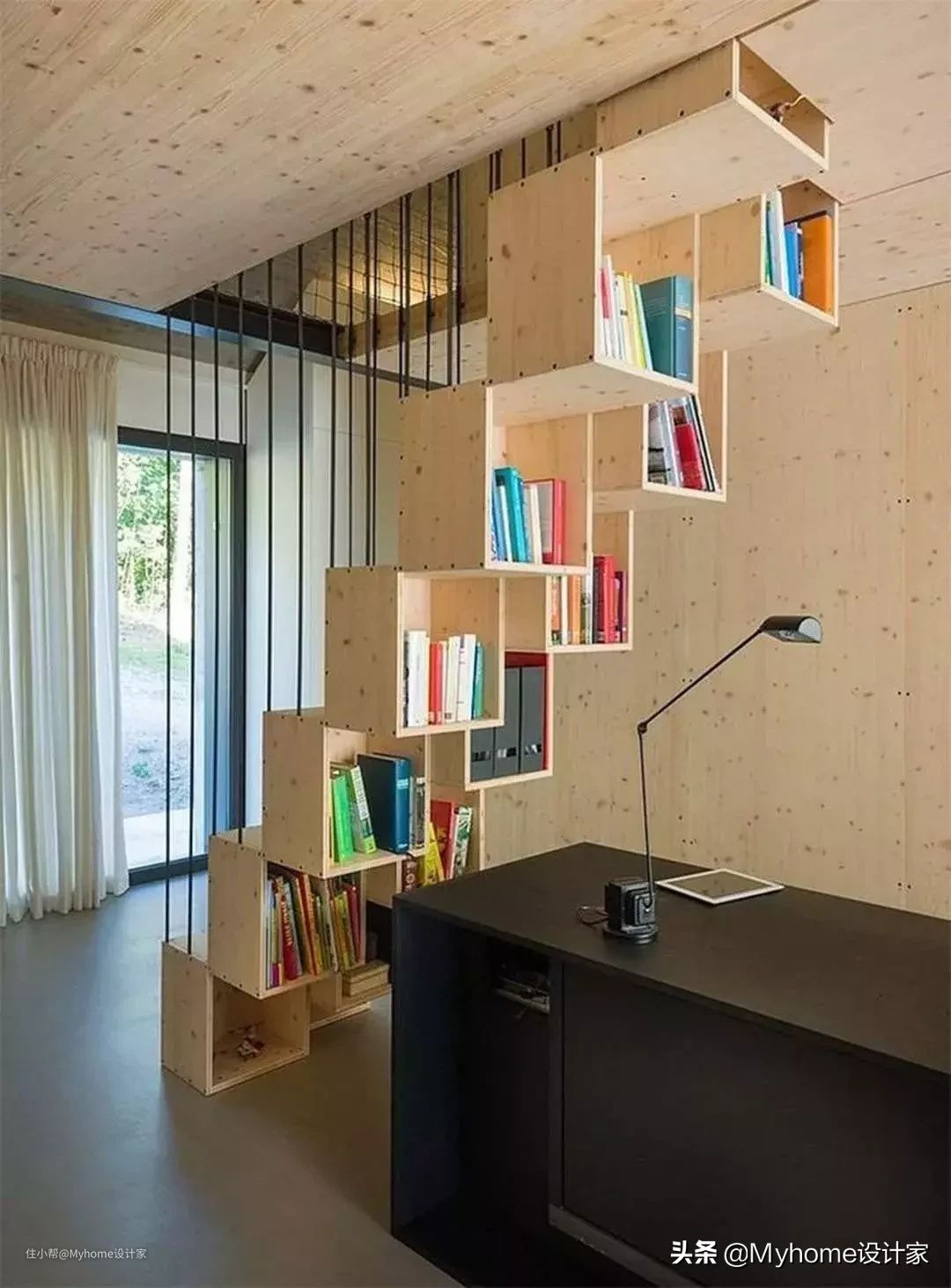 谁说楼梯都是一片片的踏步,利用方形层架组合成楼梯,背面则多了收纳空间,趣味造型让人看了不禁会心一笑。