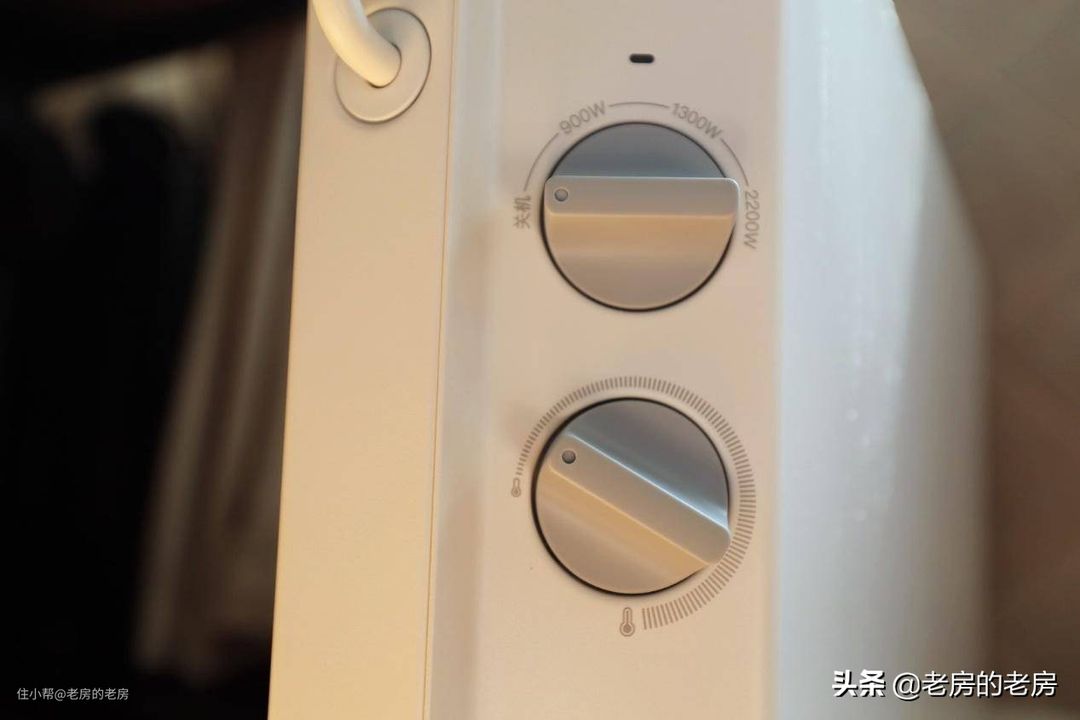 在电暖器侧边既是两个调节按钮,分别为功率调节和温控调节。其中功率档位有900W、1300W和2200W可供选择,也就是说比如我刚回家冷的很,直接切换到2200W档,迅速加热;或者热空调已经打开,但是还想再暖和点,切换至900W,辅助升温,还能稍微省点电费。