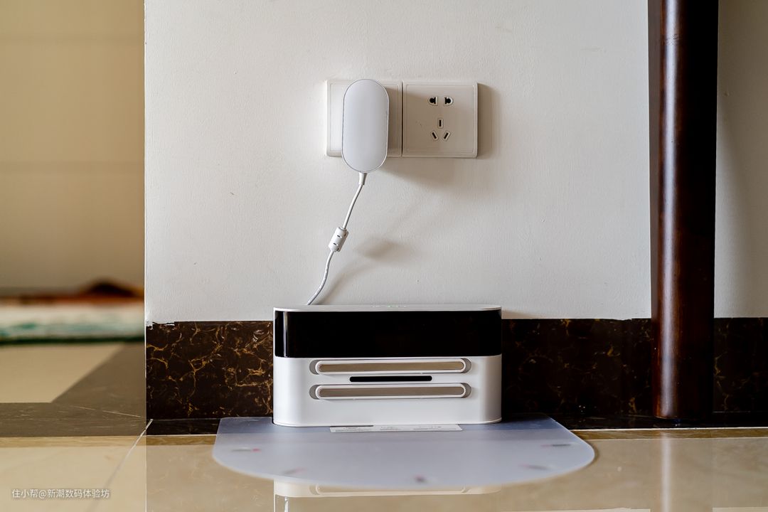 将静电贴与充电底座放在合适的位置,插上电源适配器,就可以让扫地机器人进行充电了。有意思的是,这台扫地机还支持语音操作,包括天猫精灵、小爱同学和360自家的AI音箱在内的6种智能音箱都能支持,而且标题为什么说它“话痨”呢?