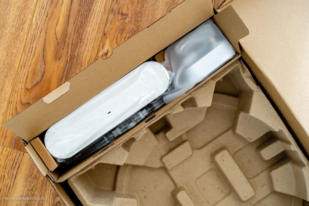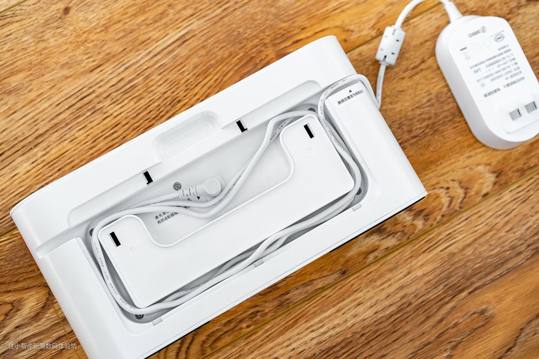 除了主机外,充电底座、电源插头、拖布支架等都在盒子里码得整整齐齐。