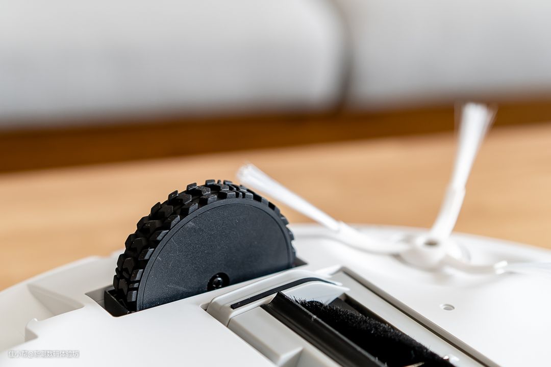 主轮的花纹让我想起越野车那抓地能力强大的轮胎,目测对防滑、脱困应该能起到很好的作用,毕竟扫地机器人本身的重量也不轻,再加上装满水的水箱,都要靠这两枚主轮来拉动,所以强大的抓地能力是很有必要的。