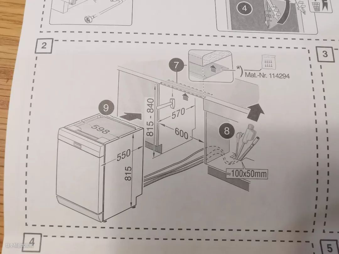水电部分预留一个三孔插座在边上千万不要在后边,同时注意进水口和排水口也要在机器两边,在橱柜底板预留100*50mm的孔用于水电线穿过,并且进水口需要6分龙头。(如果有垃圾处理器,推荐洗碗机的排水口直接接到垃圾处理器上,白色管子就是我家洗碗机的排水管接到了垃圾处理器上)