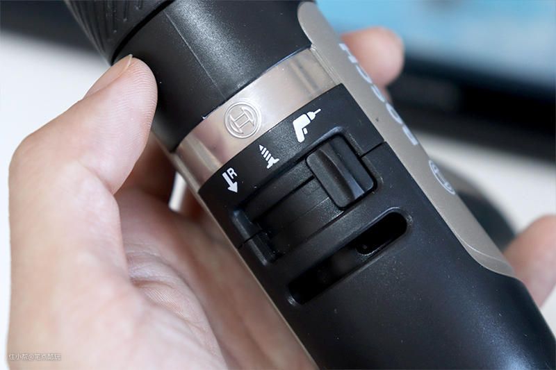 机身顶部有三档位调节拨扭,从右到左分别对应平钻钻孔,拧紧螺丝,和拧松螺丝。拨动档位到对应标识位置,即可进入对应模式。
