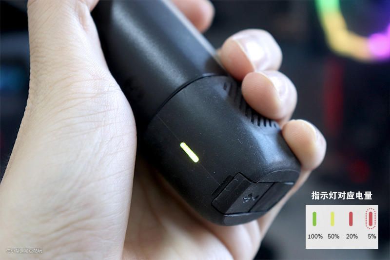 注意到握把下方这3-4cm的末端是可以自由拆卸、替换的YOU系列电池,底部有个Type-C充电口+盖子;后侧自带一枚彩色指示灯。这里有个很方便的设计,只需拿起电钻指示灯就会亮起,绿黄红对应显示剩余电量,无需按键或插线激活。