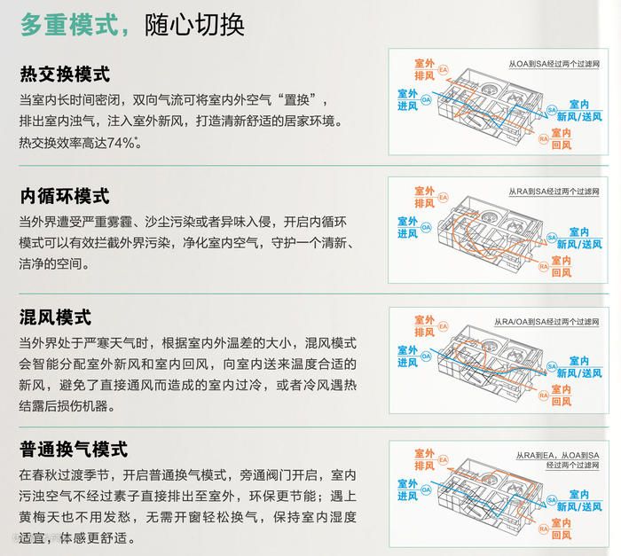 全屋新风系统:实现室内外空气交换,起到通风换气作用,并且能过滤室外脏空气,过滤和净化室内空气排出外面。