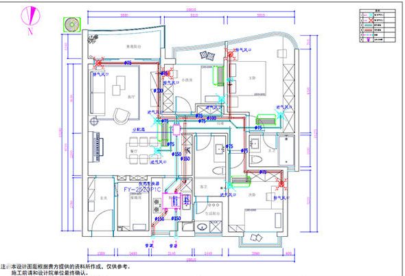 管路的走线要横平竖直,尽量水平走线,这样做会让风量更均匀到各个房间。尽可能少用90度弯头,这个角度弯头会使得风损减少50%。但是在风口末端可以用,因为这样可以保证末端风压,使得风更匀速。
