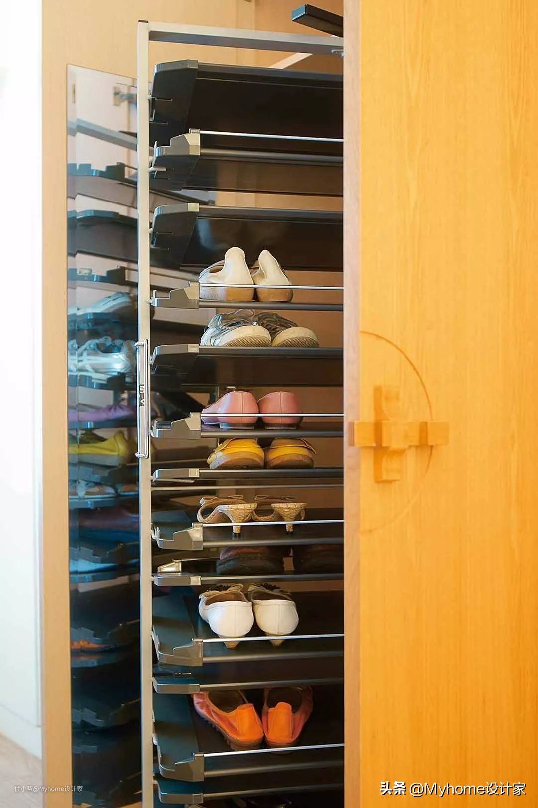 鞋柜的搁板高度通常设定在15厘米左右,为了想要收更多,收纳就得严丝合缝,每层搁板都紧贴鞋子,就能多榨出1至2层的收纳空间。