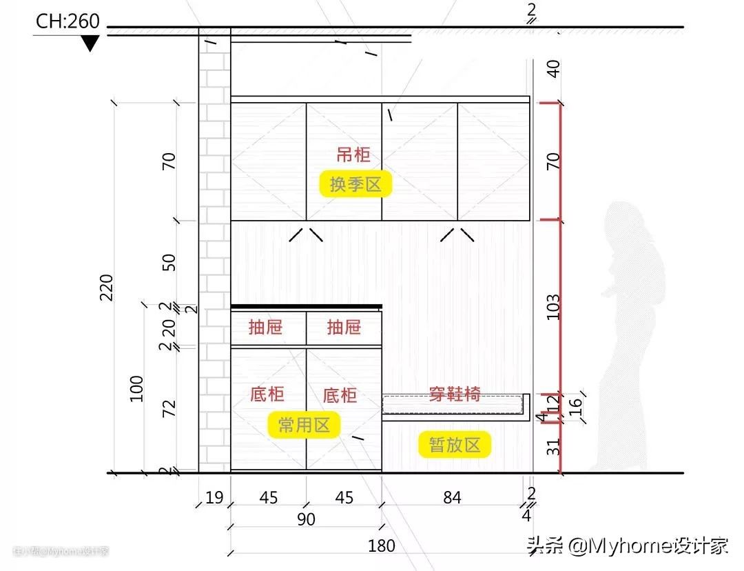 吊柜:离地150厘米,是方便拿取的高度。同样作为放置换季鞋子的区域。