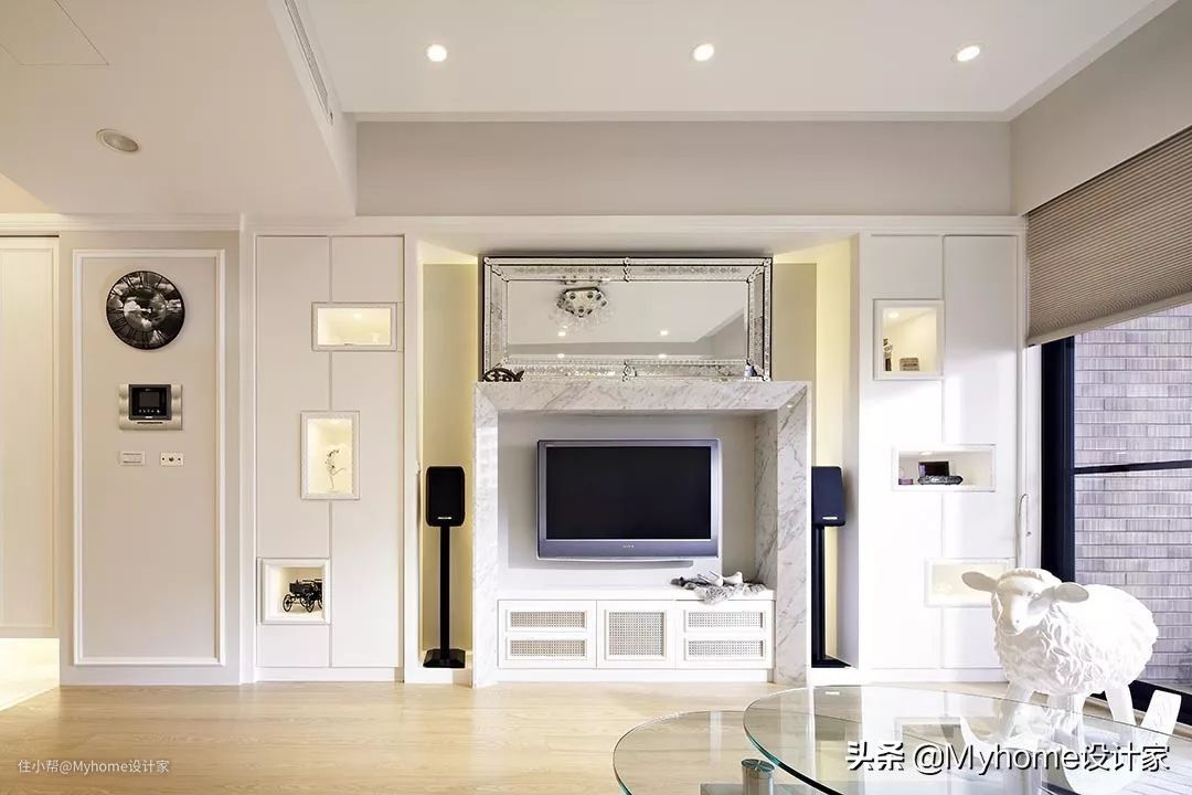 建议善用电视墙规划整面柜体,融入设备柜、展示柜与全能收纳的空间。