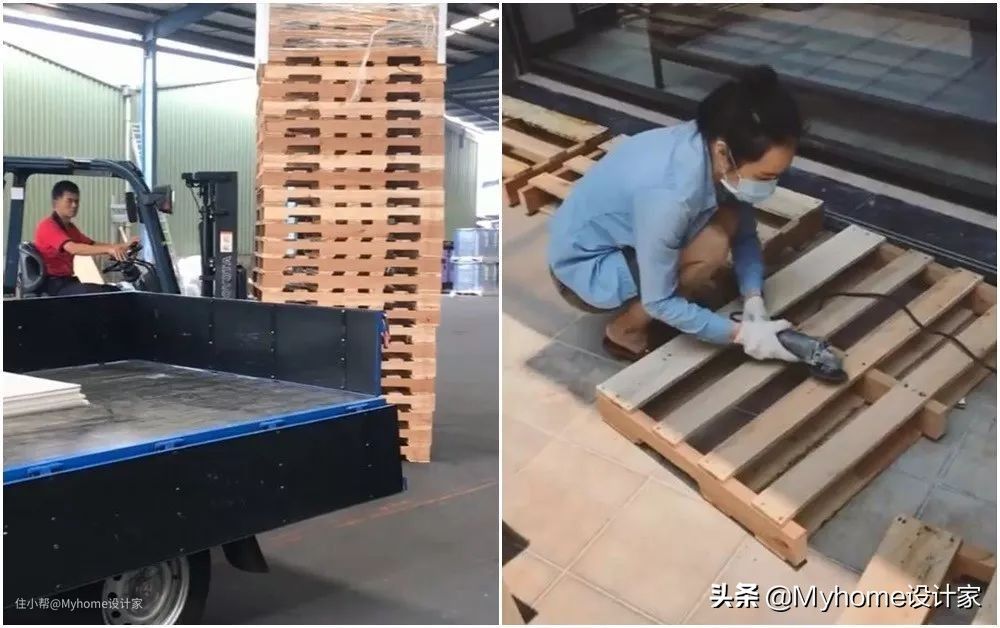 店内主要座位区为木栈板 DIY 打造而成,两人亲自去工厂挑选二手栈板,并跟亲戚借用切割机,自行裁切栈板并一块一块抛光打磨,虽然耗费了不少体力,但运费及材料费加总约莫不到人民币1200,省下购买座位区家具的大量费用。
