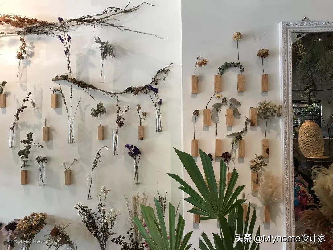 空间中唯一的大面白墙以木条挖洞、透明管作为盛装花材的容器,摆上各式各样的单枝花黏贴于墙上,成为趣味又唯美的墙面设计。不仅成为花艺店代表性主墙,也减少了购买花器的预算,同时提供了一目了然的花材展示,方便客人挑选花束。