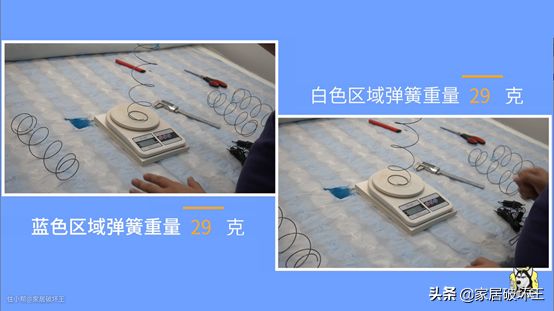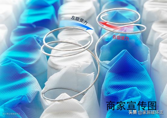 舒达这款的弹簧芯就是独立袋装弹簧,主要用到了两种布袋,蓝色和白色,这两种颜色是相间分布的。官方宣传上介绍说弹簧芯是左右旋的,左右可以精准受力,不会因受力过重把床睡塌。