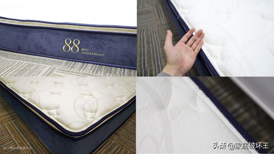 这款床垫觉得最大的不同点吧就是加固系统,没有使用任何的金属钢梁、钢钗和金属卡扣固定,好处就是确实能节省一部分材料,但带来的问题就是辅垫料之间会用到更多的胶水固定,边缘部分偏软,到底牢固不牢固?边缘是否会塌陷?辅垫料会不会位移变形以及床垫使用寿命上是否会有差别这个还得大家在实际体验中去检验了,也是未来可能会出现的一个问题吧!