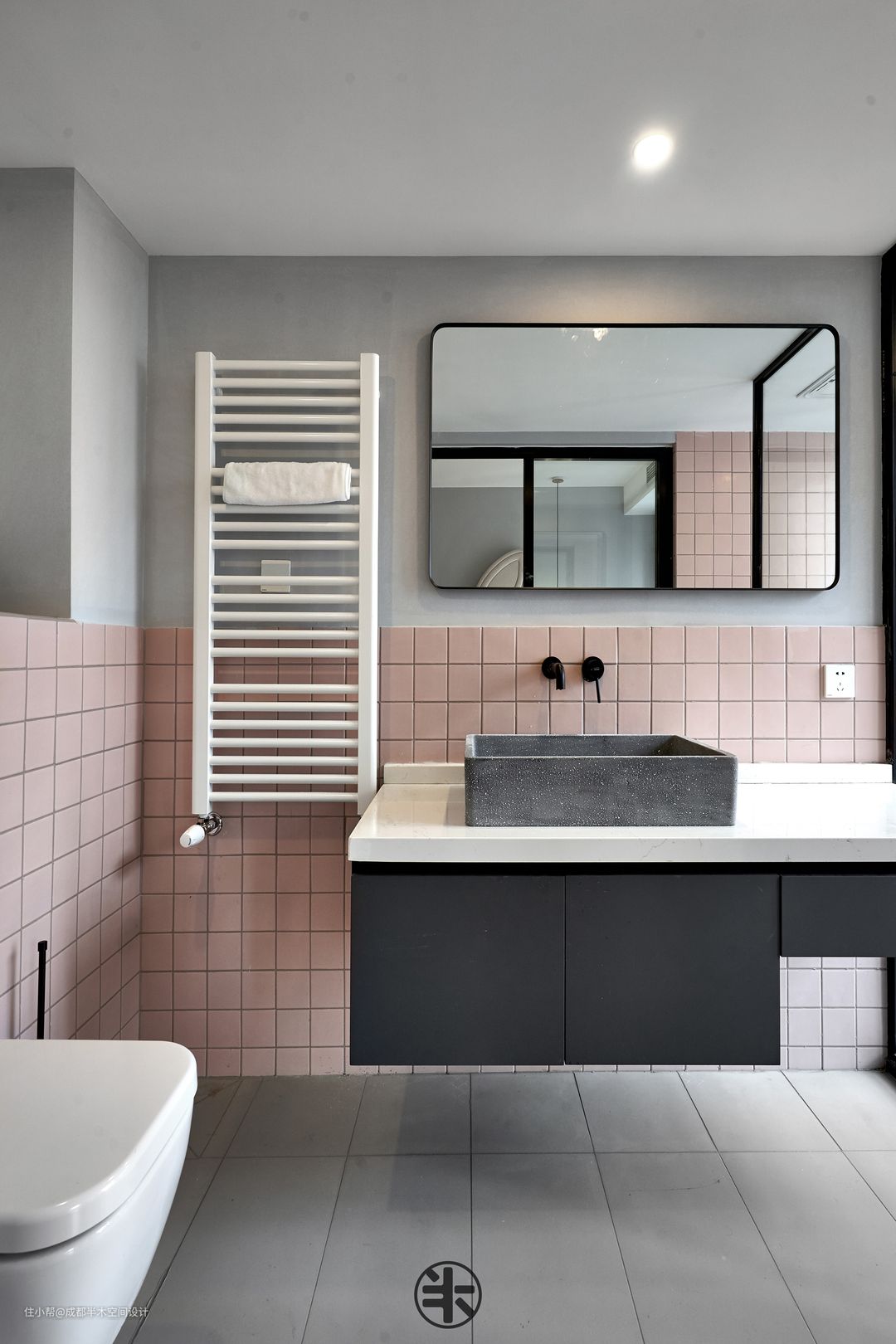 ▲主卧卫生间的小粉砖进一步延续了卧室的可爱风,但又不至于跳脱,稳定的黑白灰仍然HOLD住全场。为了极致的简约风,卫生间采用了墙排式的龙头和淋浴等。