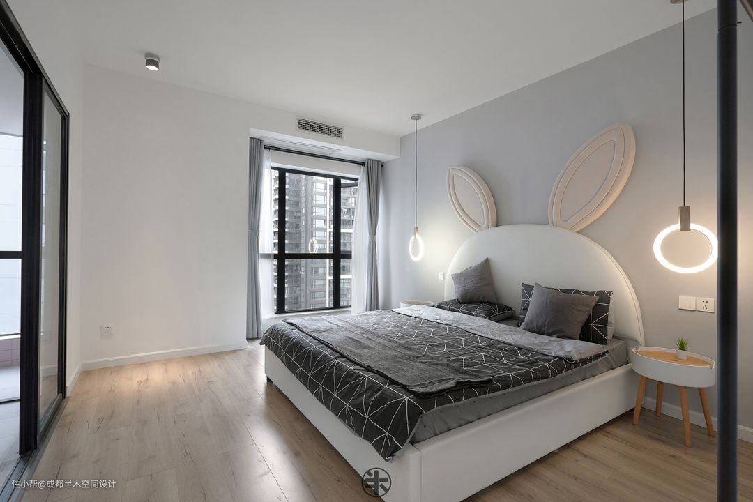 ▲卧室整体的黑白灰,适当加入木质元素就越发显得可爱了。白色的床头小柜配上细长的木质小腿,有效的中和掉了兔耳大床的臃肿感,倒像是一对白色小可爱的CP组合。