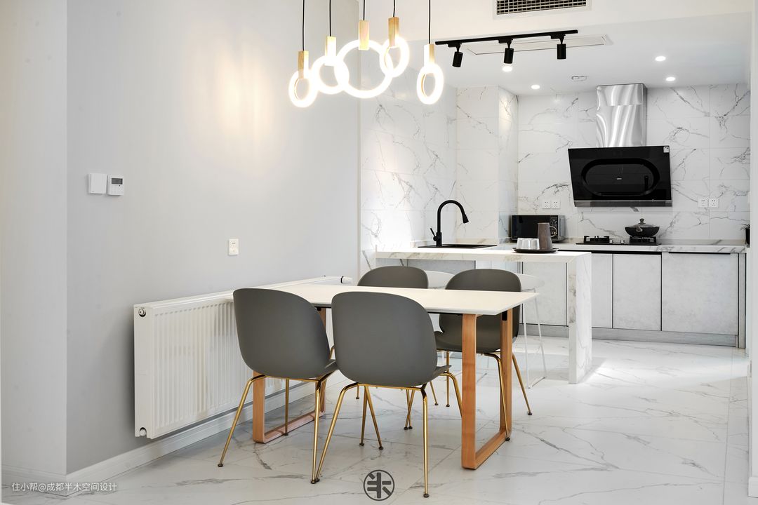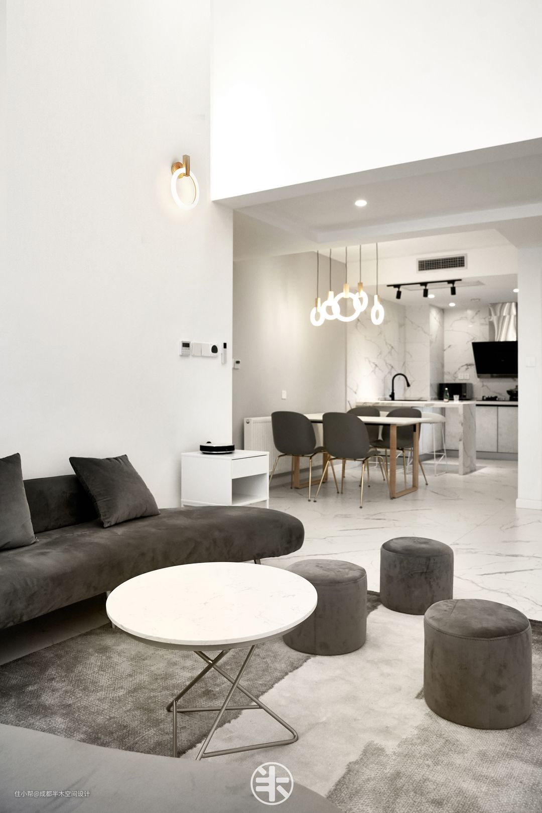 屋主是一对年轻的90后夫妇,常年旅居法国,喜欢干净通透的空间感觉。原始户型中客厅层高被挑高了许多,虽然拥有极好的采光,但与其他空间却不相融合。因此,我们对于空间规划进行了不少改造,同时运用大理石纹、圆环吊灯等元素,为屋主打造出一个精致而优雅的极简主义之家。