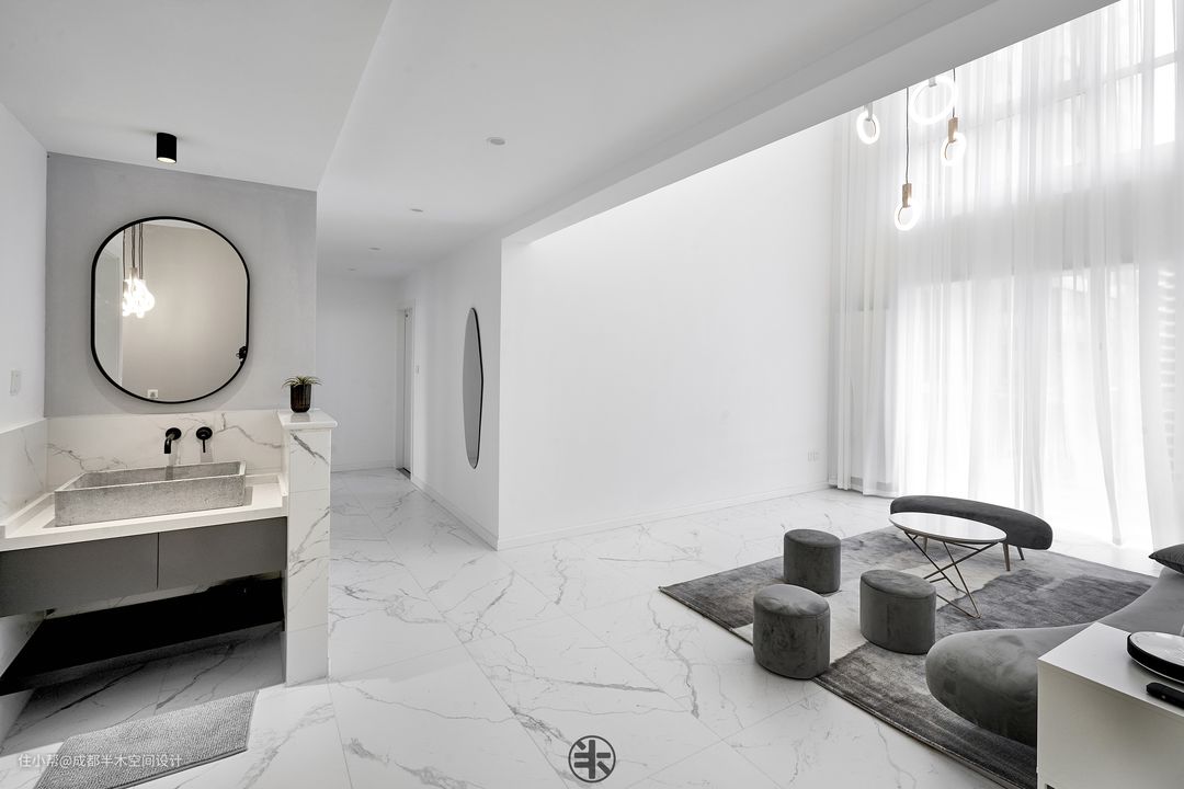 ▲因为打开了客厅与客卫的空间,回家以后映入眼帘的就是黑白灰的简约开阔。微风绕帘,光影随动,让人的身心似乎都跟着一起冷静了下来。而灰黑色丝绒质感的沙发和地毯则很好的承接起客厅的休憩属性,让整体空间温度回升而不至于过分冷清。
