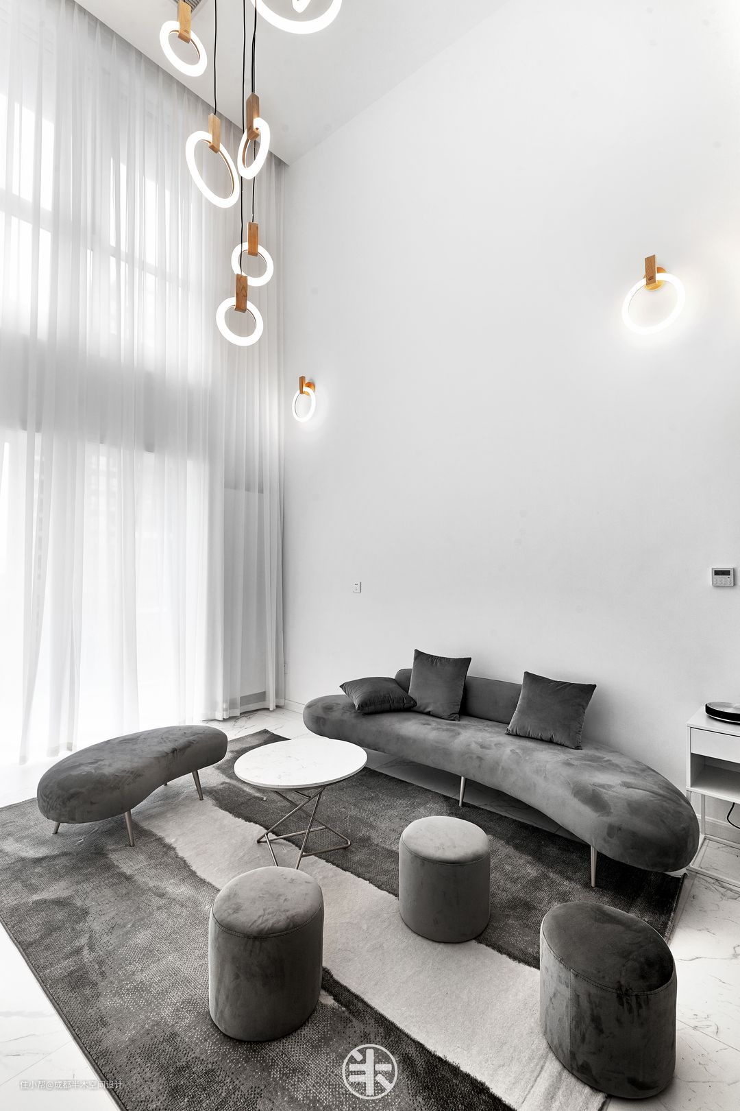 ▲吊灯的圆环、圆柱形的小坐墩,以及沙发形状合围出来的弧形,其实都可以算作是圆形元素的重复运用。在极简空间的打造中,这种有意的排列组合既让整体空间更加的协调统一,同时也增加了一丝禅意乐趣。