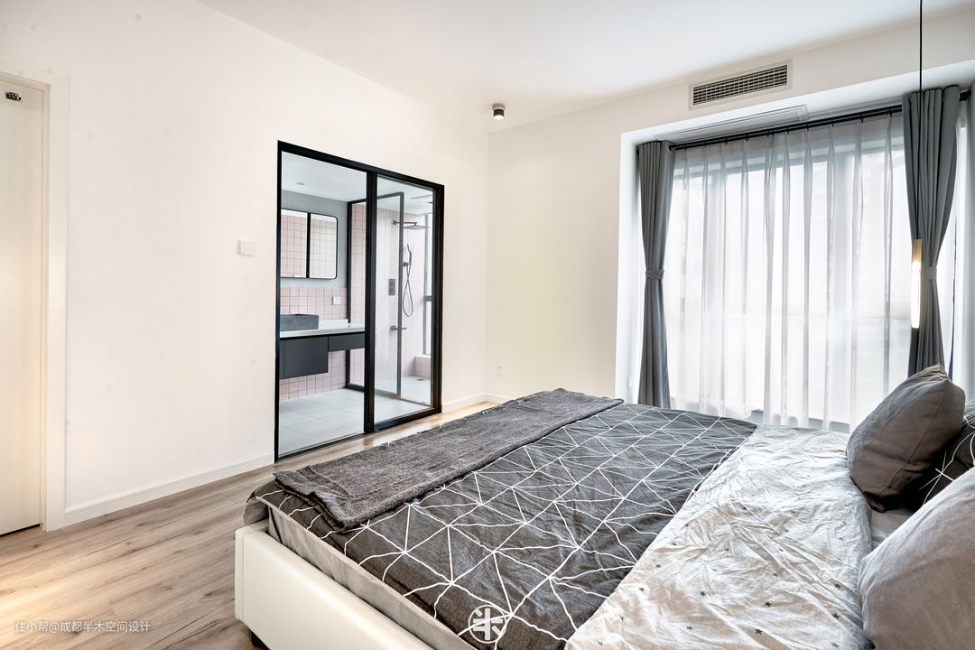 ▲虽然是极简风,但谁说极简不能温馨可爱呢?不同与国内家庭常见的卫生间高密闭高隐私的做法,本案使用玻璃黑框的推拉门将卧室与卫生间串联起来,不但视线清爽通透,且更加具有法式的浪漫趣味。