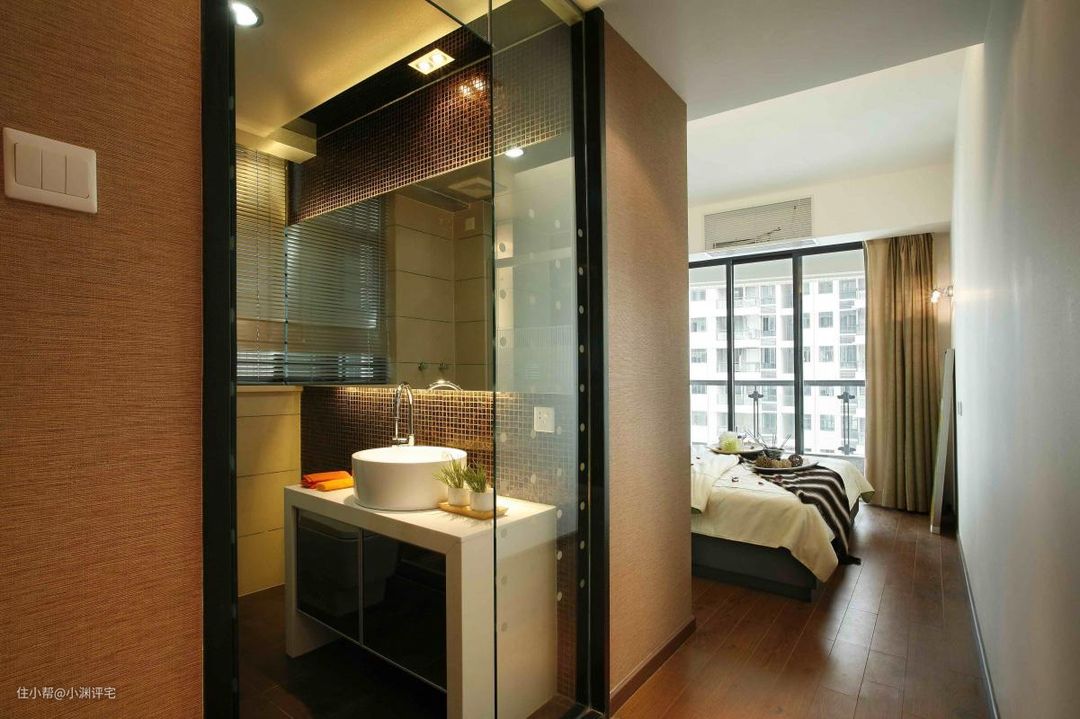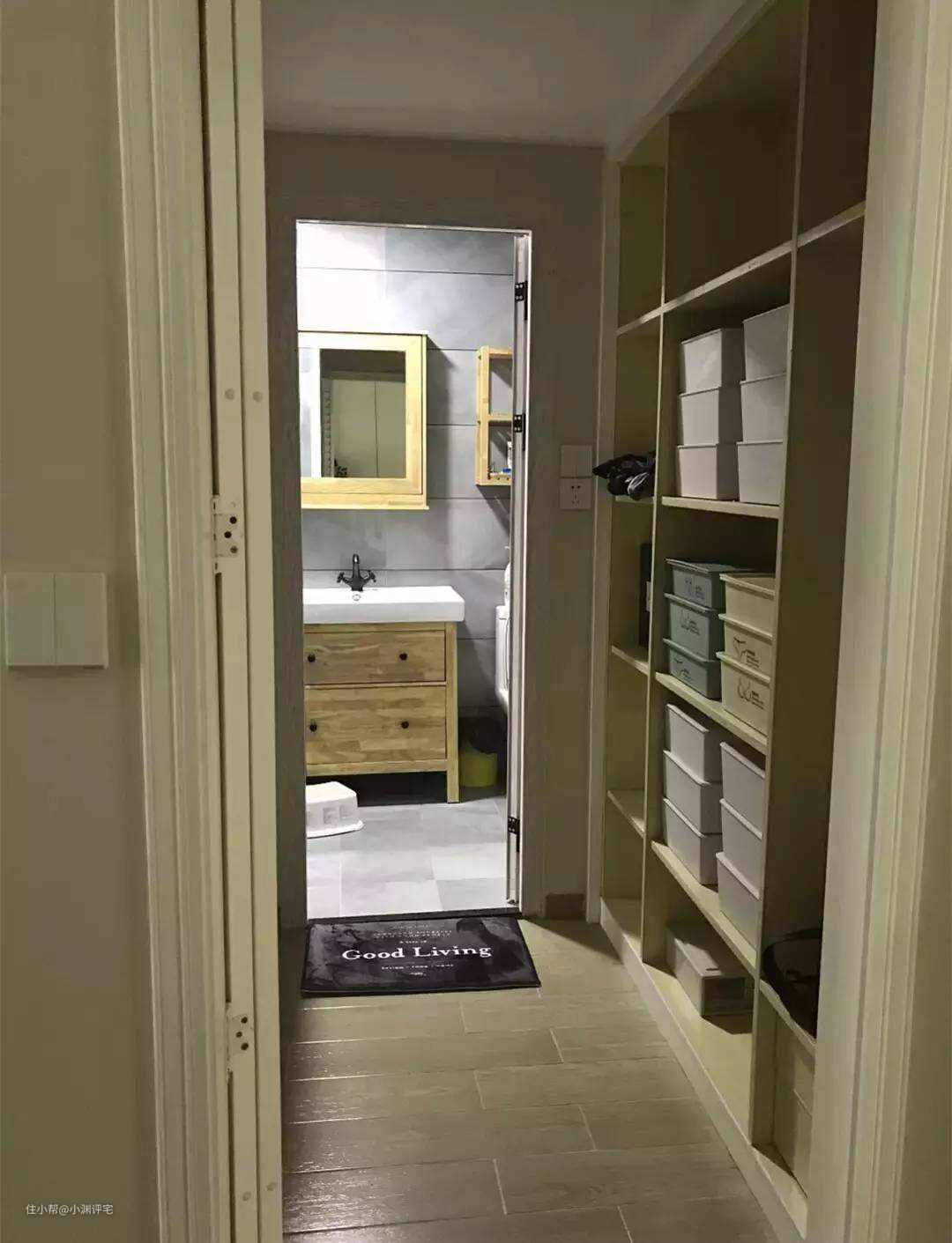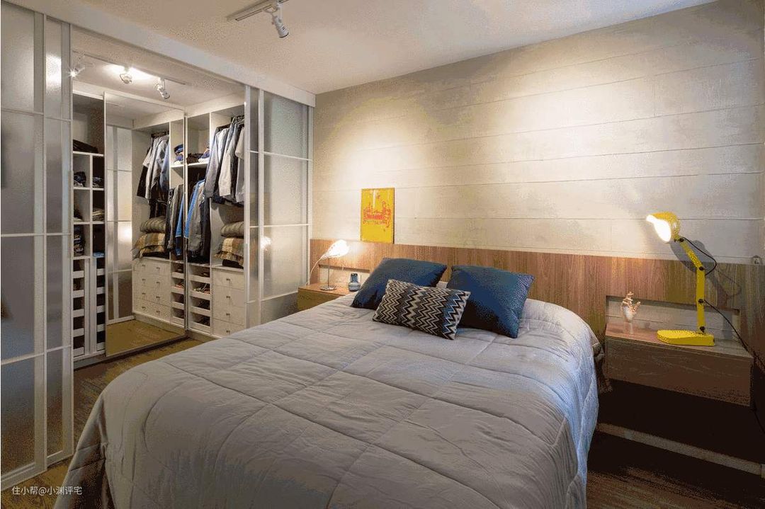 如果还想要卫生间的功能,也可以只把卫生间里的门口部分改成衣帽间。这样卫生间里的噪音和空气有了衣帽间的缓冲,对床的影响也能降低不少。不过这种做法不能放在暗卫,否则衣物就成了湿气和异味的吸收剂了。