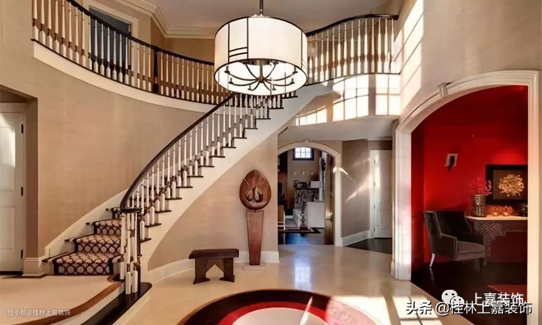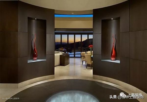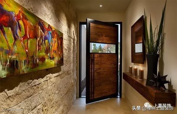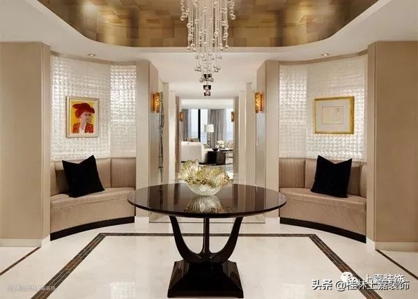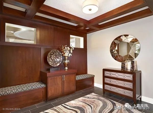 能告诉我们此门厅方式中哪个元素对你很有吸引力吗?花瓶,桌上雕塑,长凳内饰,地毯,天花板,镜子等都很赞!这的确是一个向客人或你下班回家呼喊“欢迎”的门厅!