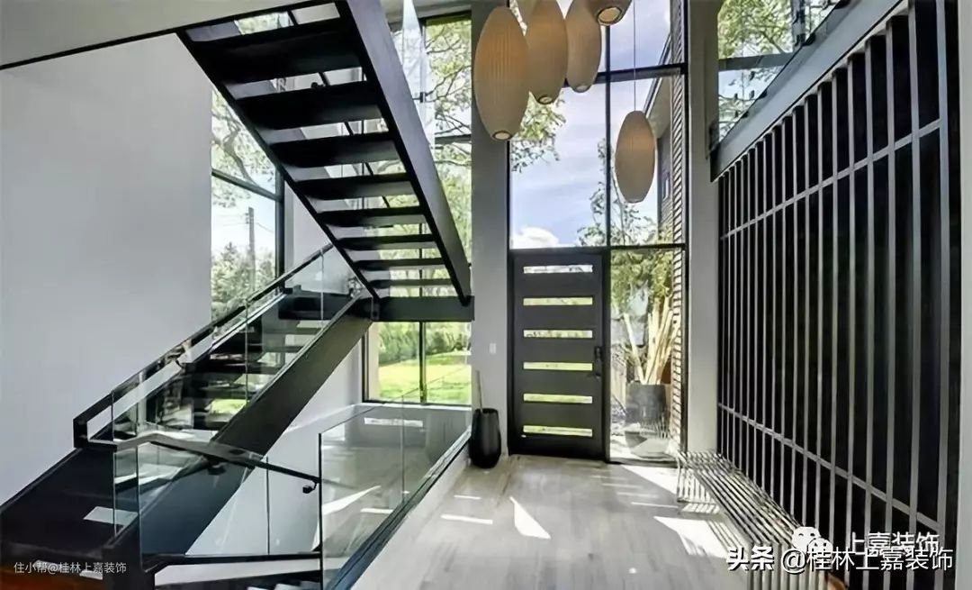 惊人的现代门厅,其特征在于:一面嵌入式玻璃板,周围是珩磨的花岗岩板和石灰石。这不仅是拍照的好去处,而且还非常适合营造一种动人的氛围——“欢迎回家”。