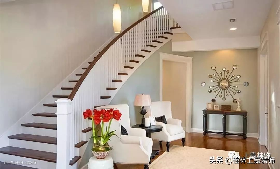 一些进入方式直接通向这样的楼梯。但是在一个区域上增加一些座位和桌子也非常不错。太阳墙面装饰是该门厅的重点装饰。