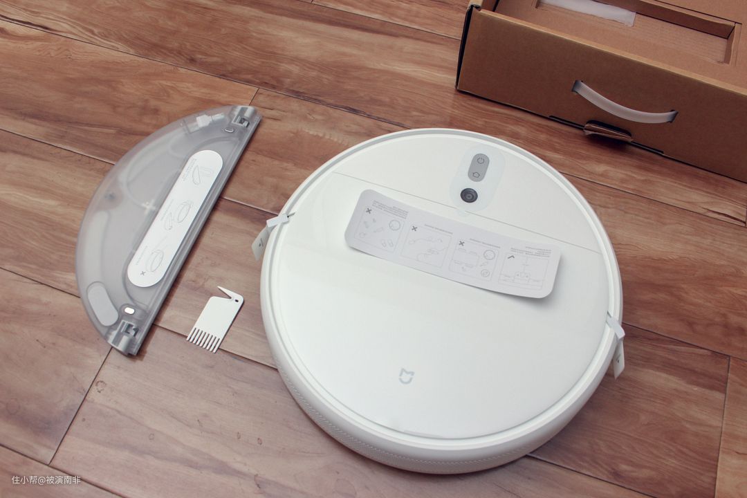 水箱下方包装着的就是扫地机器人了,纯白色的设计很漂亮,因为是视觉导航,少了激光导航的那种明显的凸起,机身上方只有两个按钮和一个摄像头
