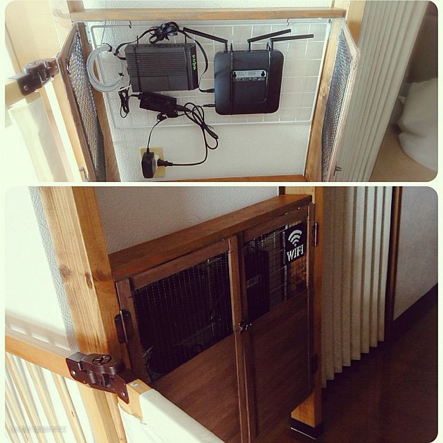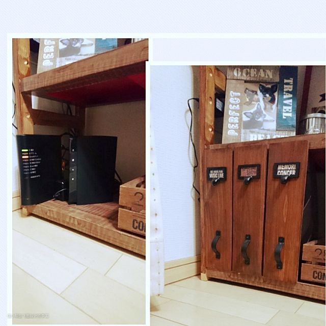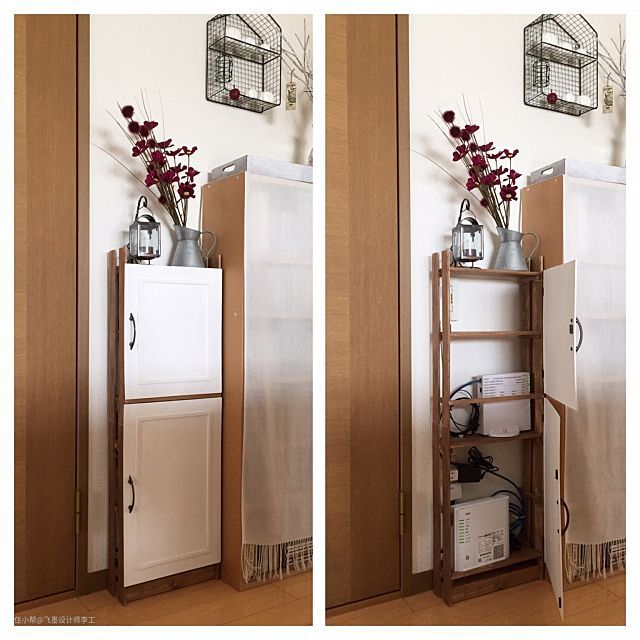 在置物架上安装柜门,造成收纳柜的效果,实际上却放置着路由器。柜门借助磁铁,很轻松实现打开和关闭。