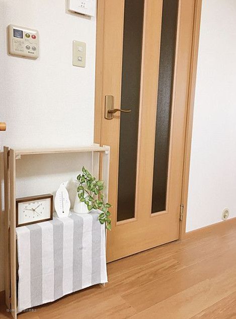 在墙角放上双层置物架,将路由器放在底部,上面用眼罩布进行遮盖,再利用摆件、钟表点缀,完美实现隐藏,也装饰了小角落。