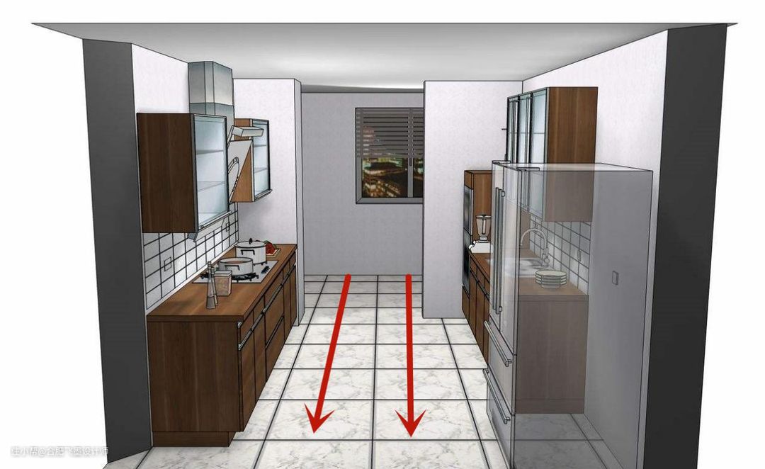 另一边是:切菜区(砧板、刀具)→洗菜区(水槽)→收纳区(冰箱、收纳柜)
