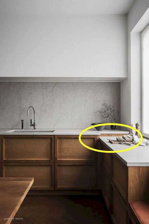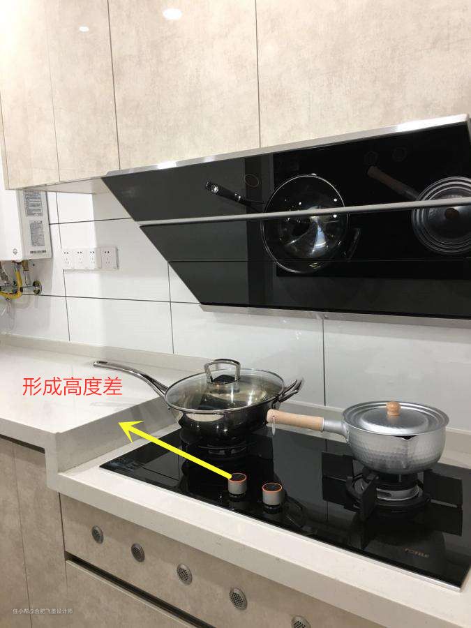 因此设计师建议:原本在同一台面的水槽部分台面要抬高,灶台部分需要降低,这样两者就形成了高度差。
