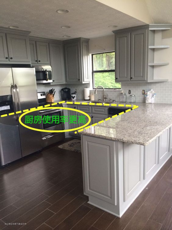在参观厨房的时候,我就发现他家厨房灶台与我家的不一样,为什么他家烹饪灶台比整个厨房台面要低,形成了明显的高差呢?而我家厨房台面都是在同一平面上?一看实用性就不一样!