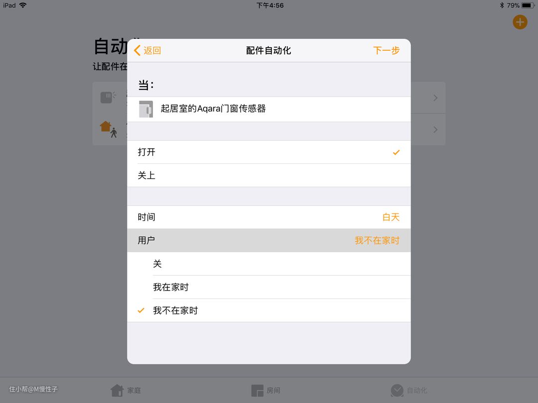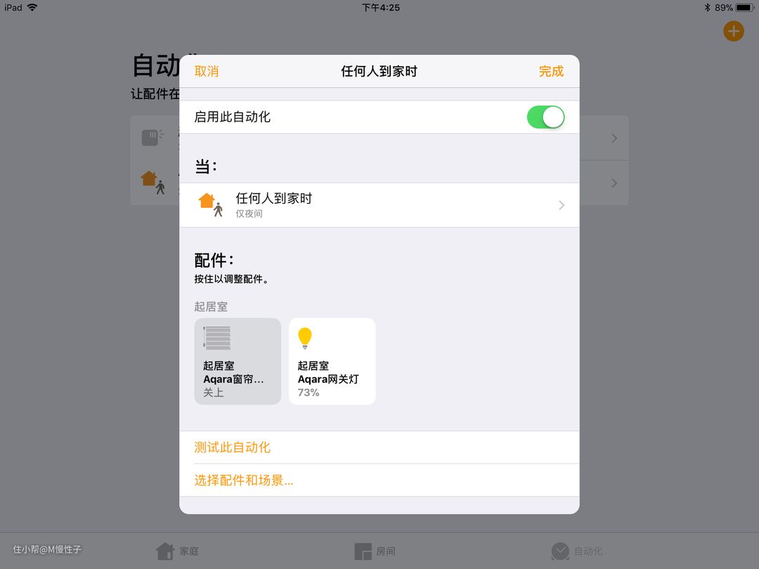 ▼回家场景,当gps定位到家后,触发回家场景,开灯关窗帘,这里把时间设定在晚间时段。还可以根据你的AppleID指定具体的人,比如只有家中某一人到家才触发场景。