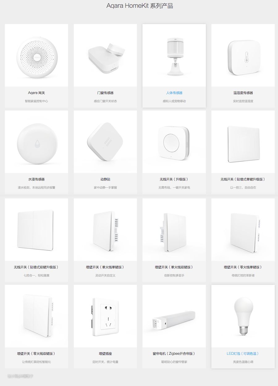 ▼Aqara目前总共有29款设备接入Homekit,包含了智能开关、插座、网关、人体传感器、温度传感器、灯泡、窗帘电机、等。可以实现绝大多数的智能控制,包括灯光、安防、窗帘等。可以说目前使用homekit做智能家居系统,Aqara几乎是唯一的选择。