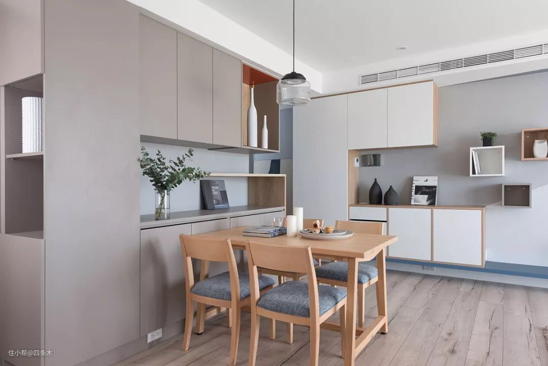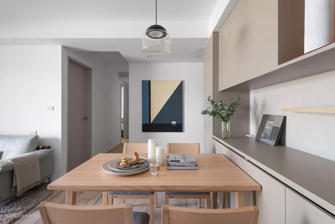 餐厅的地方摆放了实木餐桌,搭配一盏吊灯,看起来很简洁,另外旁边还定制了一个餐边柜,灰色的门板设计,简洁大方,同时又可以增加很多收纳空间,这样设计,好看又实用!