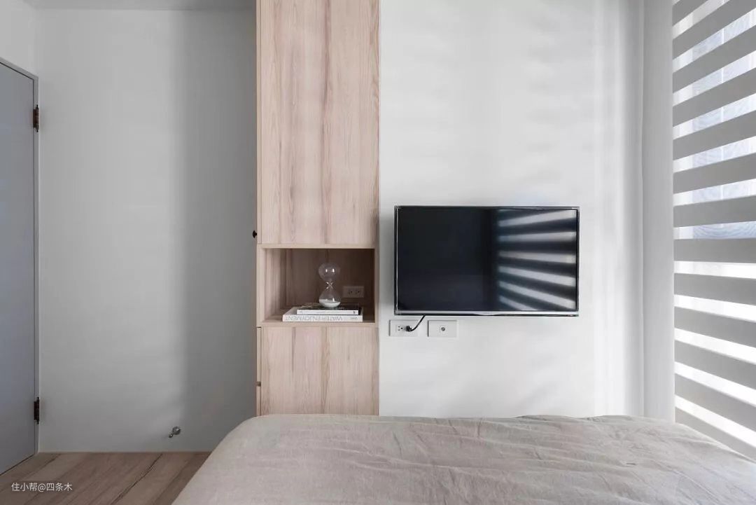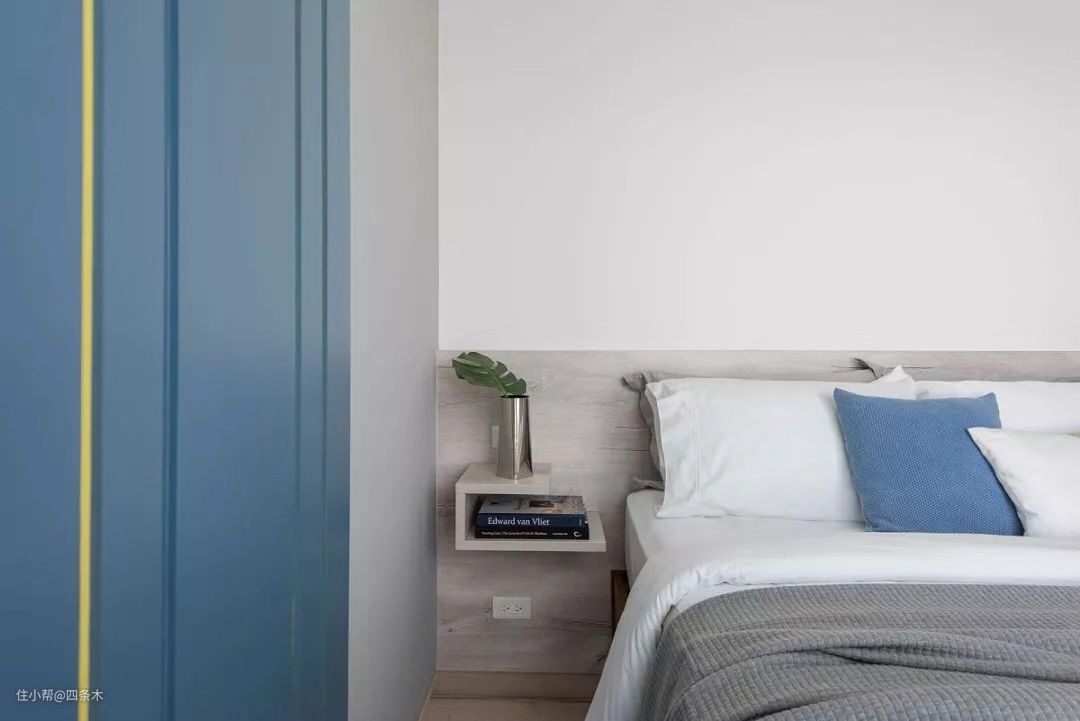 主卧床头背景墙定制了护墙板,空间比较小,就不摆放传统的床头柜了,和背景墙一起定制一块小隔板当床头柜,可以用来摆放眼镜、杯子等小件物品,这样设计,非常节省空间。