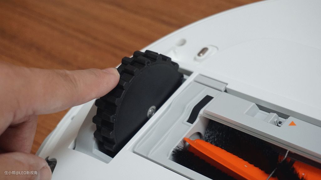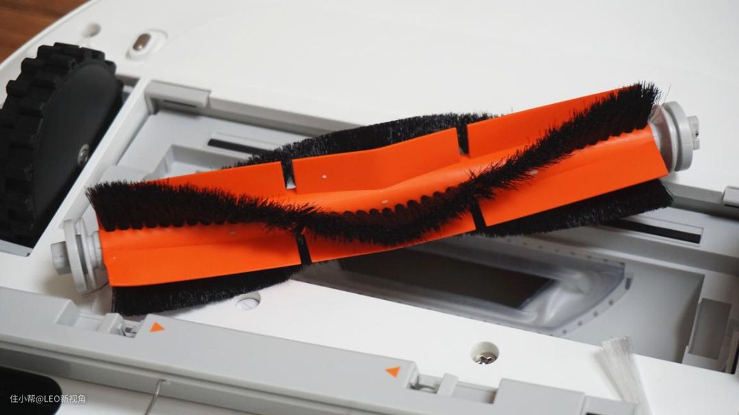 中间的滚筒刷,也就是主刷,可以拆卸,上面除了一层刷毛设计,还有一层红色的硅胶刷,起到多重清洁效果,这样的结构也是目前大部分主流扫地机人所采用的。