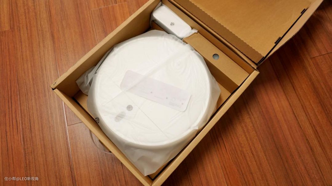 开箱,就可以看到产品主体了,一台纯白色的扫地机器人,因为采用的是视觉导航,所以机身的顶部是平面设计,而采用激光导航的,在顶部都会有一个凸起。