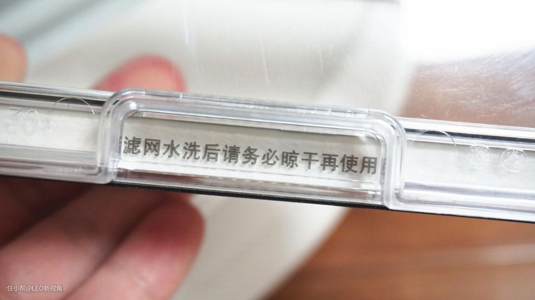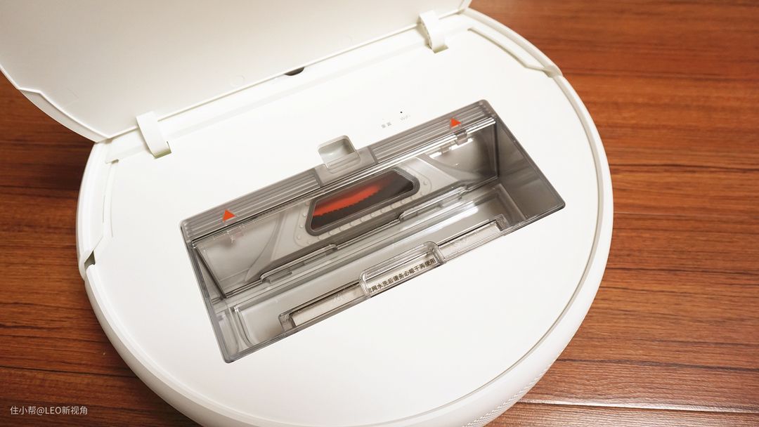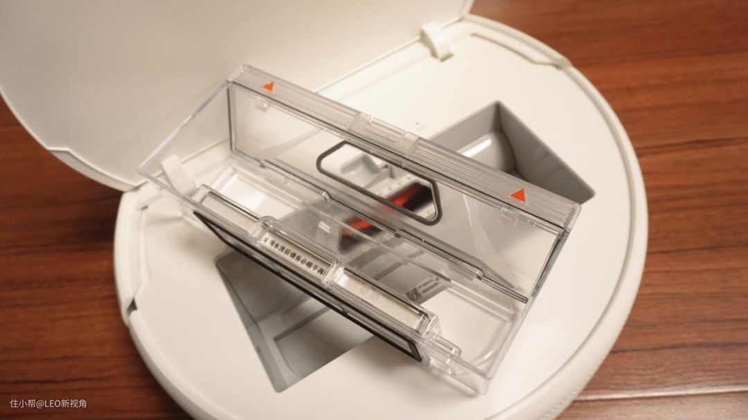打开顶部的盖子,是一个全透明的尘盒,尘盒的进风口周边都有橡胶圈设计,可以有效的防止扬尘和二次污染,另外可以看到尘盒上的滤网是可以重复使用的,并且可以水洗。不过有提醒滤网清洗后需要晾干才能使用。