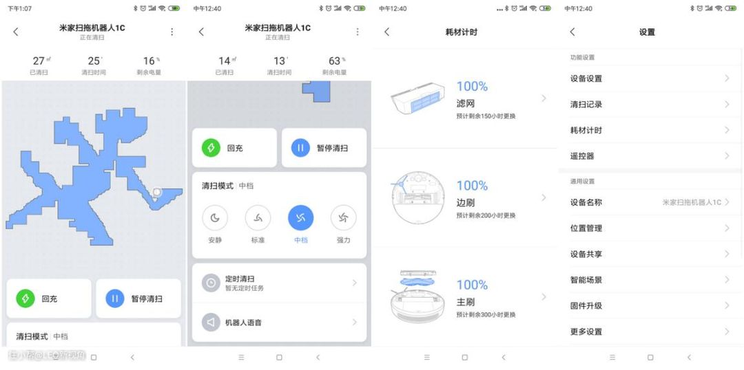 米家的产品,自然是加入米家APP了,可以通过APP上实现四种模式控制,查看耗材寿命,这里有滤网、边刷和主刷三种耗材的使用情况。另外,还可以在APP上定时清扫、语音选择中文切换、清扫记录查看、遥控器功能等等。