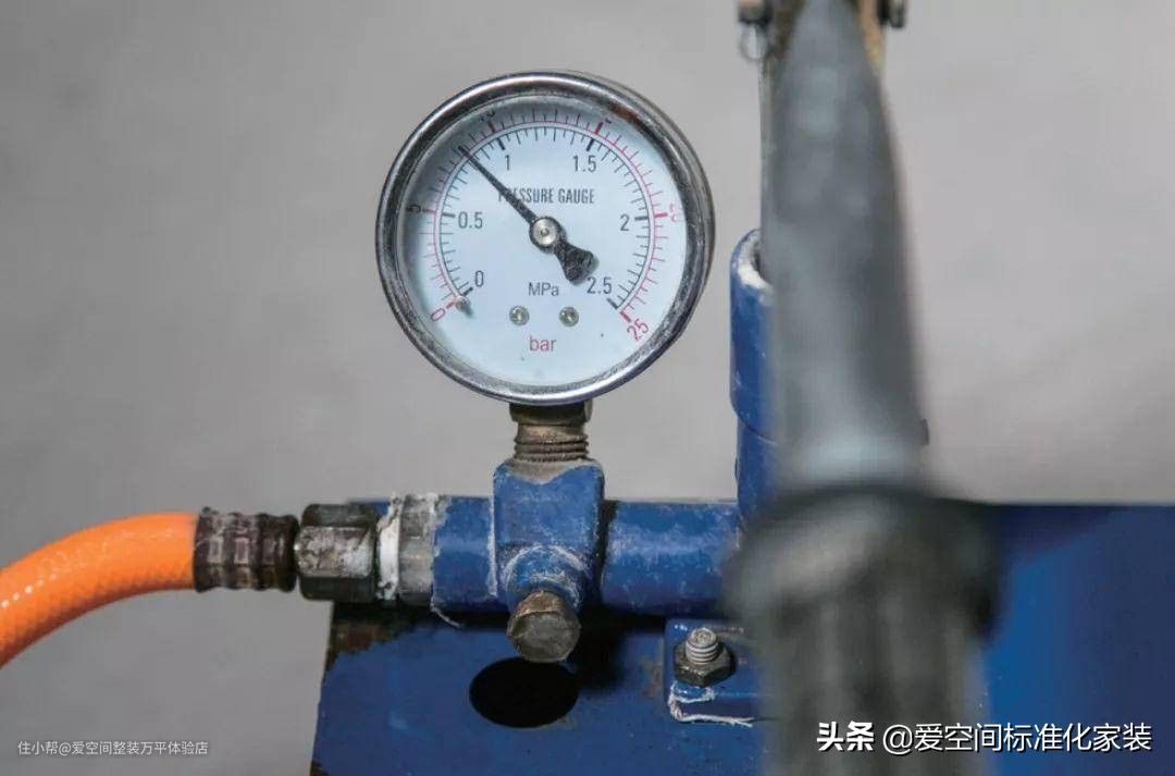 爱空间测试标准:正常市政供水压力在0.4兆帕(4公斤)之内,试验压力不低于市政水压的1.5倍,0.6兆帕。为了增加安全边界,使用打压泵打压0.8兆帕,恒压1小时,压力下降不大于0.05兆帕,且管路无渗漏为合格。