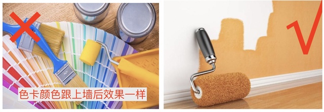 错误原因:很多人会认为色卡上的颜色就是实际上墙后的颜色,这其实是一个误区。因光线反射等原因,墙面颜色通常会比色卡上的颜色更深一些。左图中,认为色卡与墙面颜色一致是错误的。